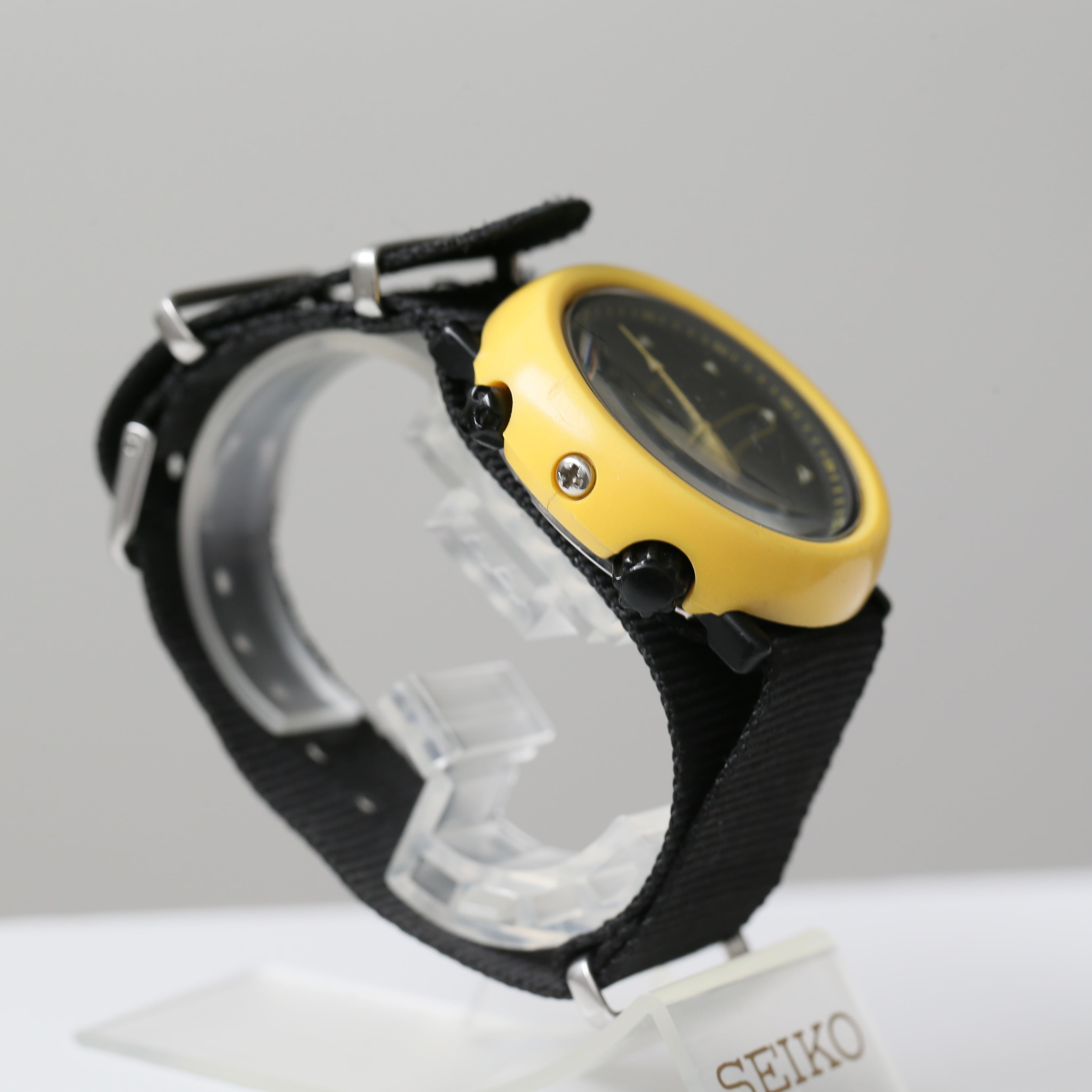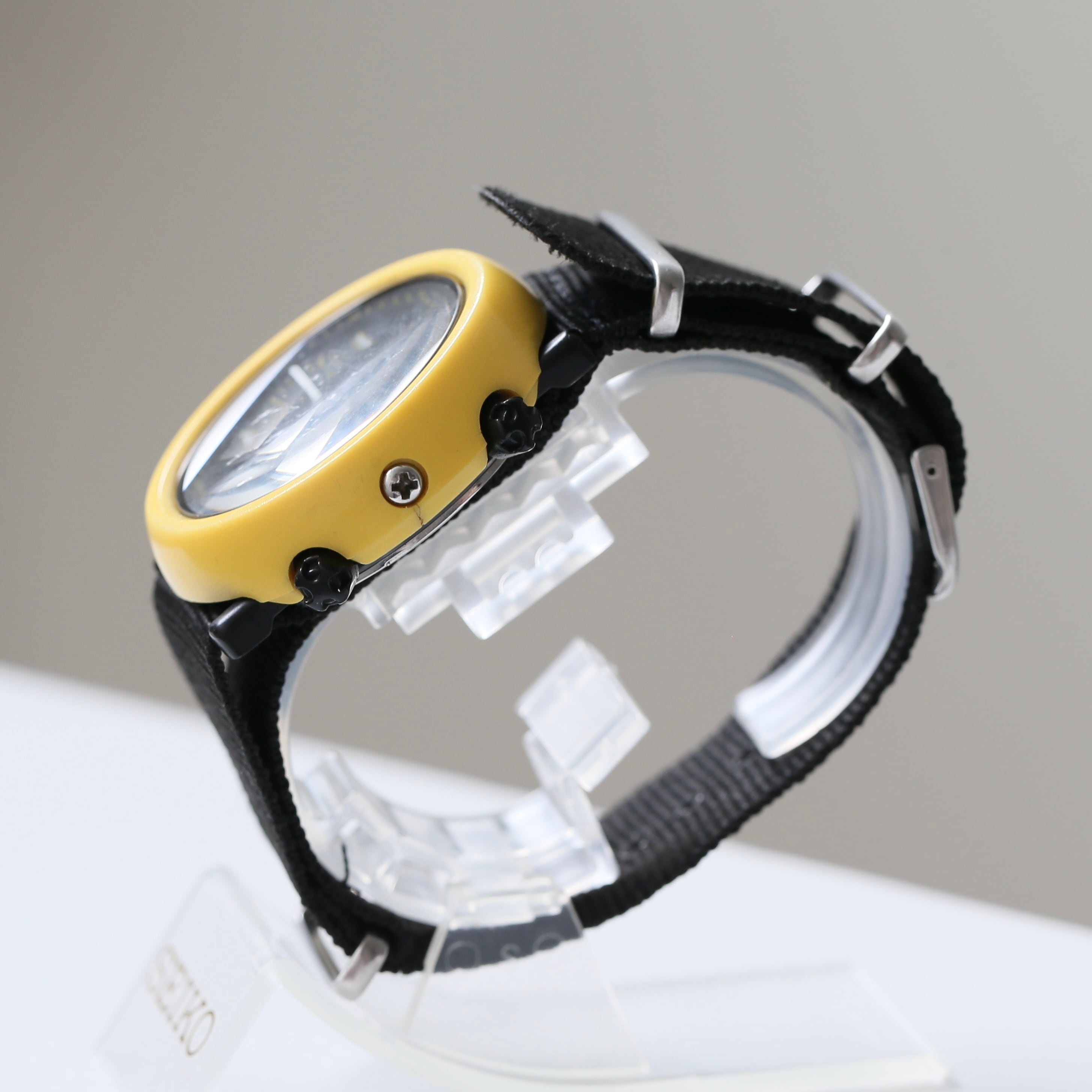 80年代のサーフィンブーム期に発売されていた、ビンテージのサーフタイマー。イエローケースにブラック文字盤、ボタンが素敵なカラーリングです。 状態は画像でご確認ください。