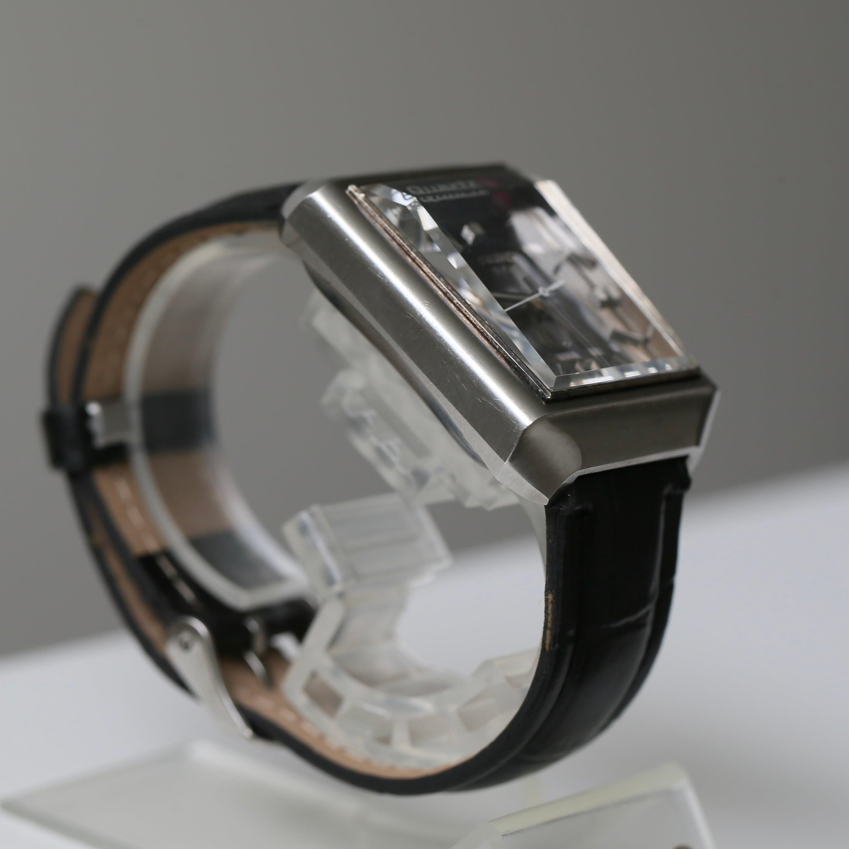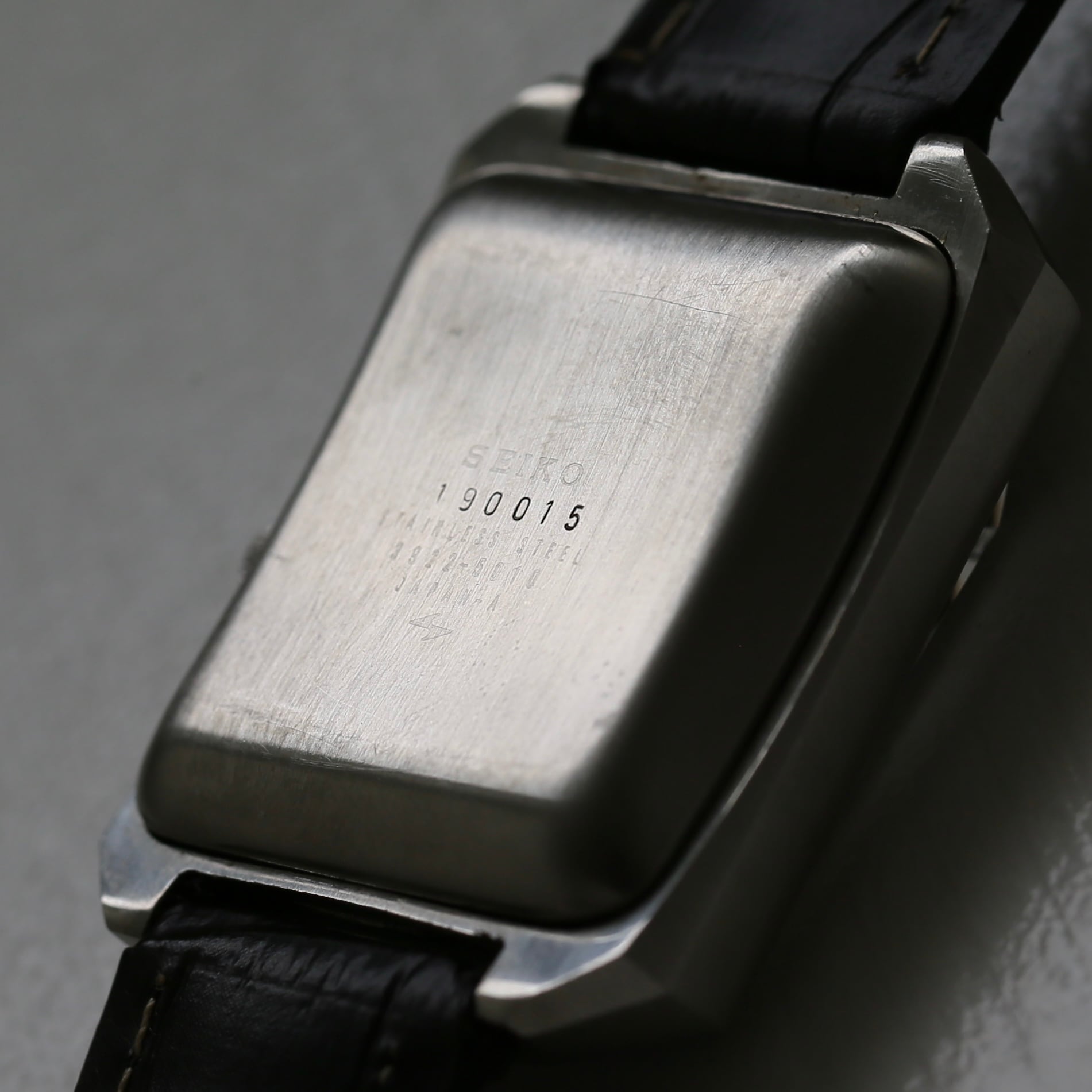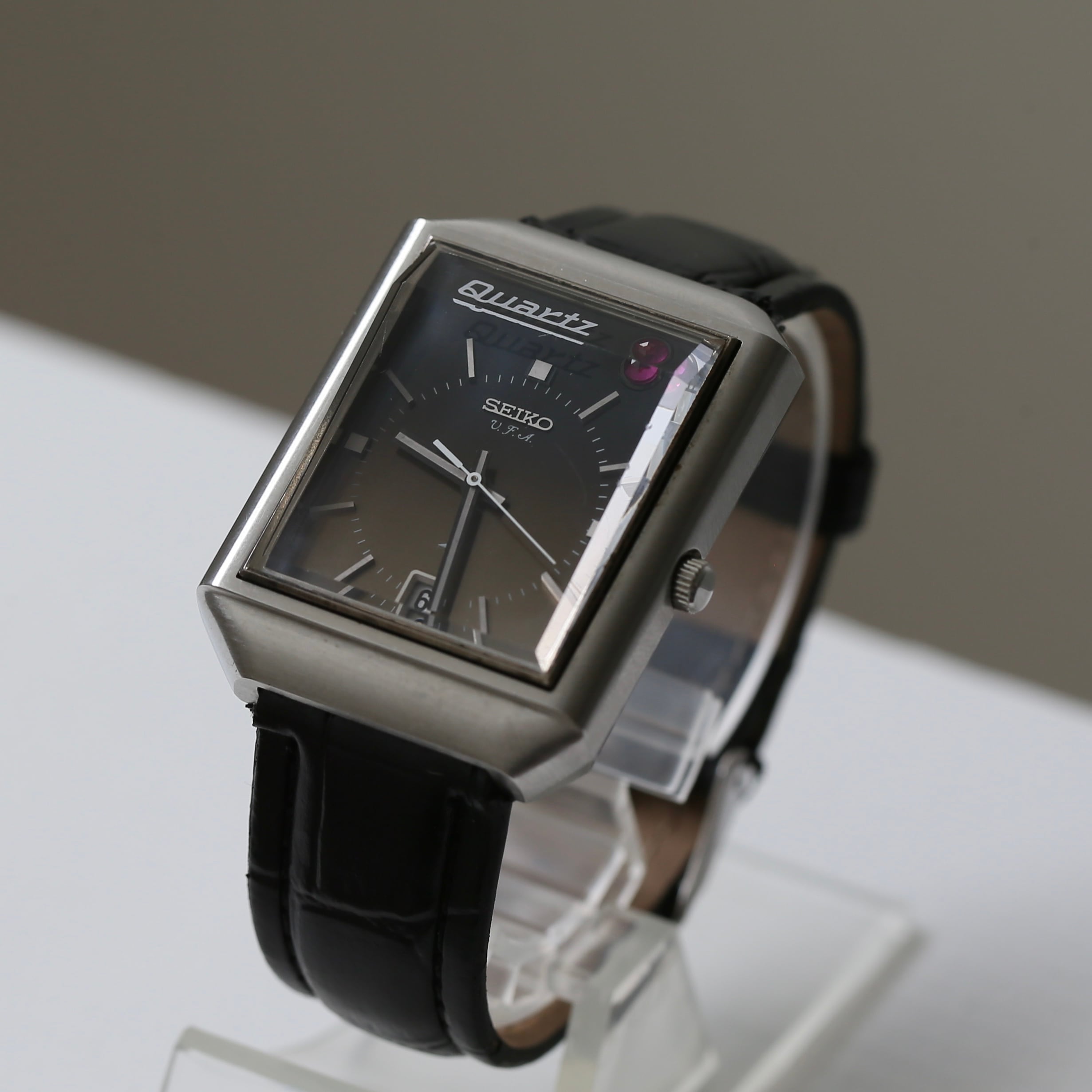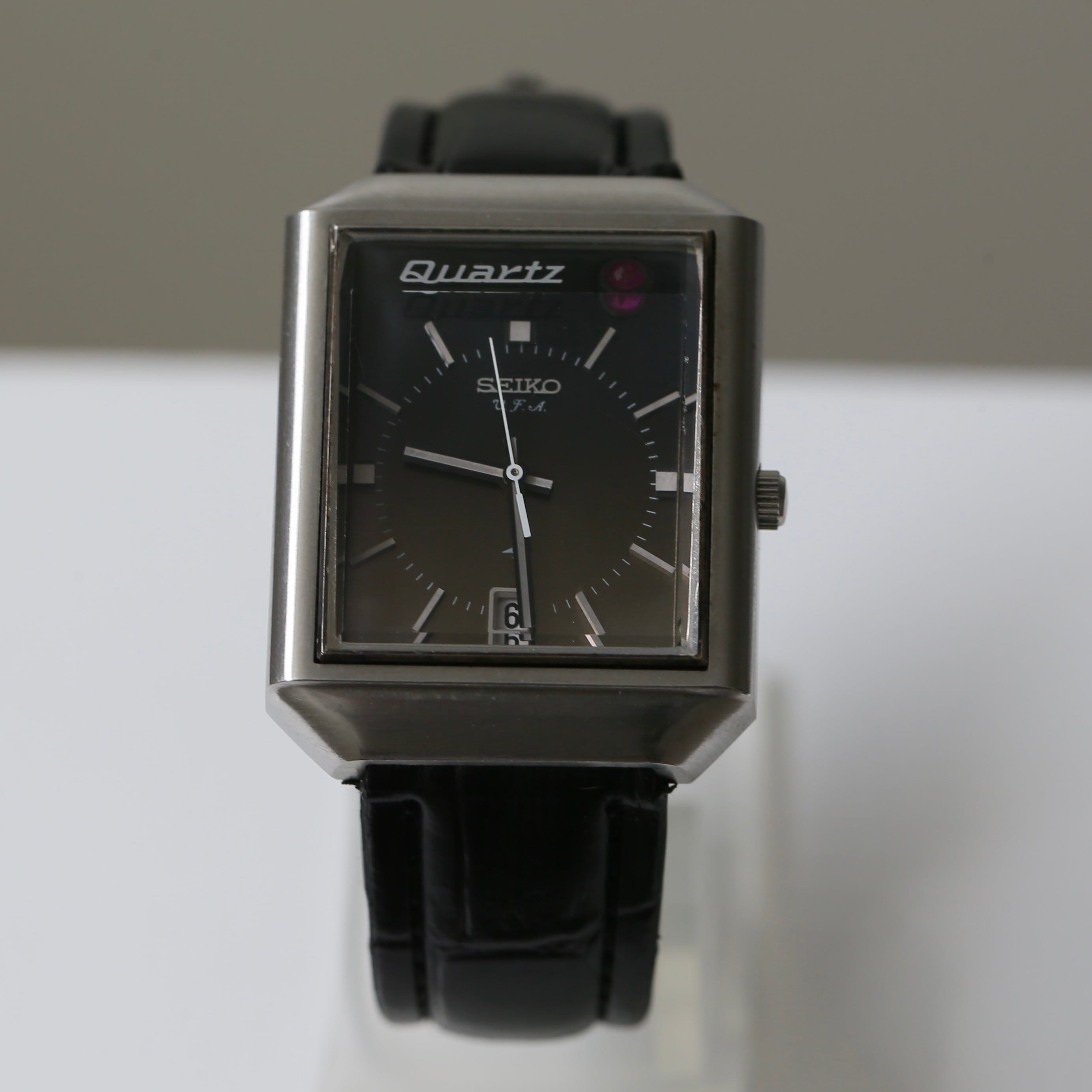 ボリュームのある角型フォームに、各秒LEDが点滅する 39V.F.A フラッシュセコンド(V.F.A 39SQC) クオーツモデルになります。この時計は、世界初のクオーツ『アストロン』が1969年に発売になり、絶賛される中にあって、その次世代の省電力ムーブメントを搭載して1972年に発売された腕時計であり、ダイアル表記の「V.F.A.」とは Very Fine Adjusted の略で「特別調製品」を意味し、水晶腕時計検定基準の最高グレード試験にも合格したモデルでもあります。その特徴は、ダイアル右上の赤色発光ダイオードが1秒ごとに発光する「フラッシュセコンド」機能が搭載されたユニークな機能が搭載されています。
